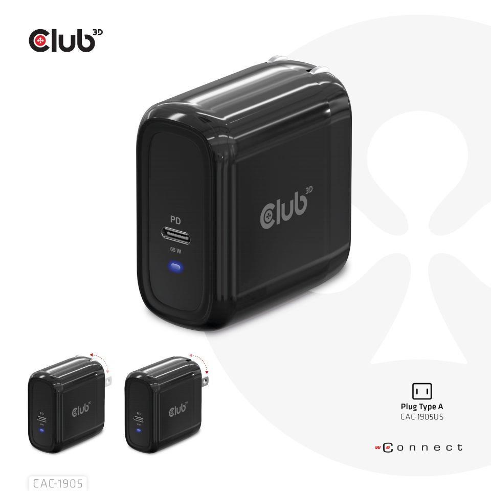 The Club3D CAC-1905 Travel Charger PPS 65W GAN technology, Single port USB Type-C, Power Delivery(PD) 3.0 Support. Compact size & Superior Performance: GAN technology chipset makes this charger 50% smaller than a 65W MacBook chager, small enough to carry anywhere.The Programmable Power Supply(PPS) 65W wall charger match a variety of PD devices from smart phones to laptops, one for all making charging simple. This wide compatibility charger will be your convenient companion during your business trip or vacation.