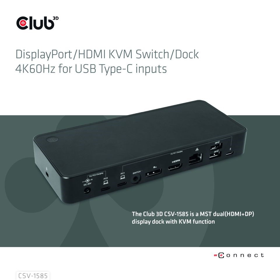 Club 3D CSV-1585 je dokovací stanice MST s duálním (HDMI+DP) displejem s funkcí KVM. Dva USB Type-C vstupy pro připojení dvou různých hostitelů pro rychlé zvýšení produktivity mezi dvěma hostiteli, stačí jedno kliknutí na horní tlačítko nebo kliknutím na tlačítko dálkového ovladače připojeného kabelu. 3xUSB Type-A+3xUSB Type-C poskytují dostatečné připojení pro externí zařízení s přenosem dat až 5Gbps. 120W stejnosměrný zdroj poskytuje 65W napájení (PD) pro nabíjení vašeho notebooku USB Type-C nebo hostitelských zařízení. Kompatibilní s jakýmkoli zařízením podporujícím režim DP Alt Mode s portem USB Type-C, jako je notebook, stolní počítač, tablet, telefon atd. Podporujte nabíjení pomocí portů PC1 a PC2, stisknutím tlačítka POWER SWITCH přepněte vstupní napájení. Použití 20V/6A 120W DC napájecího adaptéru pro napájení dokovací stanice, mezi 65W nabíjením pro hostitele PC2 současně. Externí napájení pro PC1 přes port USB Type-C1, nabíjecí výkon závisí na adaptéru PD. Se zámkem Kensington. Zapoj a hraj.