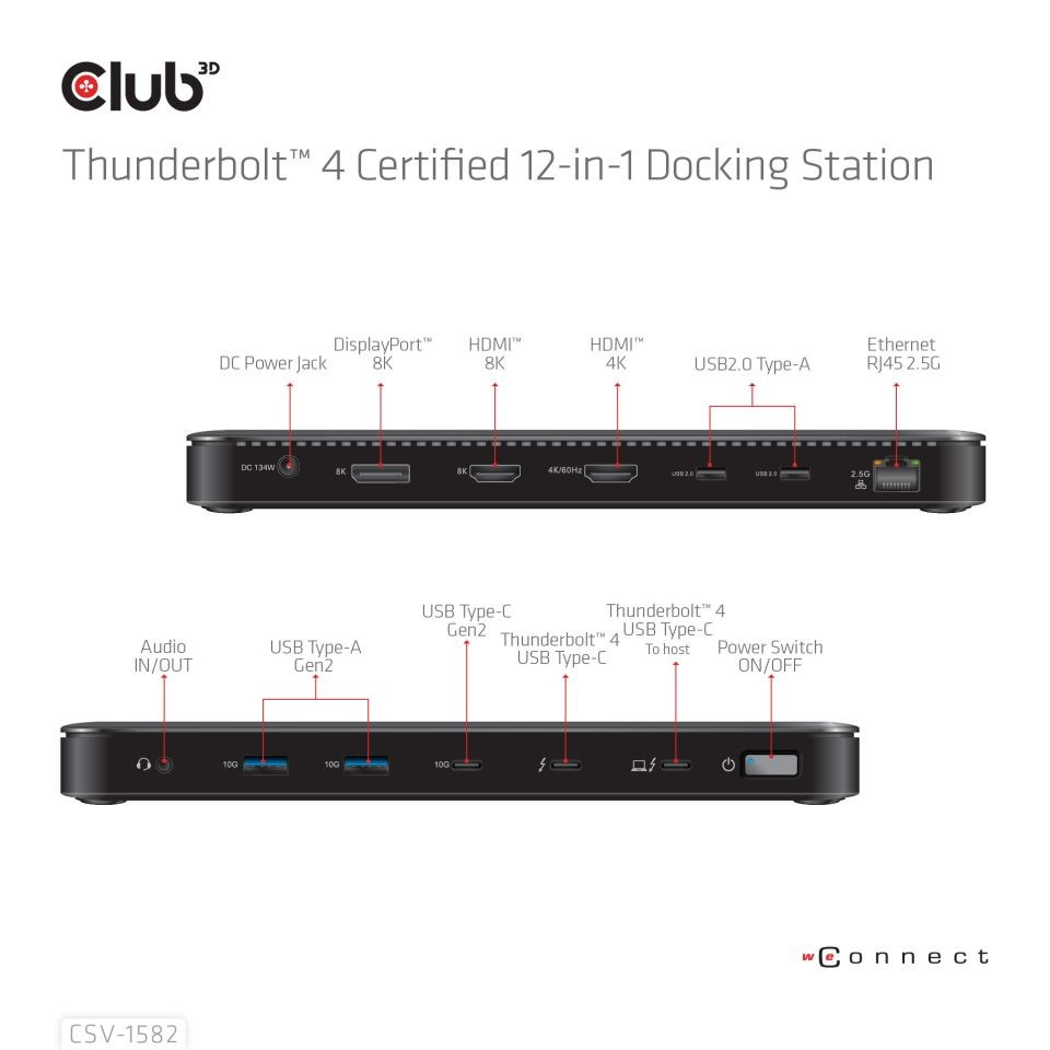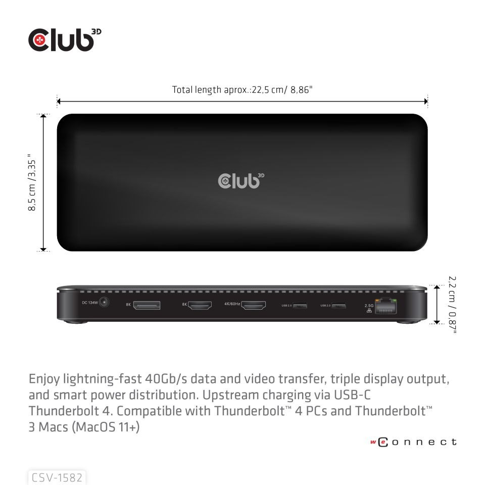 Club 3D CSV-1582 je certifikovaná dokovací stanice Thunderbolt™ 4 12 v 1, která poskytuje nejpokročilejší, nejúčinnější a nejvšestrannější dostupné I/O řešení s rychlostí až 40 Gb/s pro data a video. Kombinace funkcí TB4 se snadností integrované dokovací stanice, která vám umožní vysílat 3 streamy na 3 displeje současně s rozšířenými stolními displeji na TB4/USB4 Windows PC. Ethernet RJ45 podporuje maximální šířku pásma 2,5G. Porty USB podporují přenos dat až 10G. Dokovací stanice podporuje funkci smart power, která umožňuje distribuovat energii podle spotřeby energie připojeného zařízení s plným využitím externího napájení. Je navržen pro počítače se systémem Thunderbolt™ 4 a Macy založené na Thunderbolt™ 3 využívající MacOS 11 a novější verze.