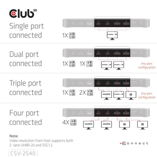 CSV-2540 je přenosná dokovací stanice 14 v 1 USB Type-C® 10Gb/s na čtyřnásobný displej s režimem 2 pruhů DisplayPort™ 2.1 Alt , která slouží k rozšíření portu Type-C® na více portů pro video, data, zvuk, Ethernet a napájení a představuje ideální řešení pro splnění požadavku uživatelů na rozšíření. Má 4 videa (výstup čtyř 4K/60Hz videí současně, pokud hostitel podporuje oba UHBR10&DSC) pro přenos videa, 5 portů USB pro přenos dat. 2,5 Gigabit Ethernet pro ultrarychlý Ethernet, čtečku karet microSD/SD, 3,5mm kombinovaný audio konektor. Kromě toho je tato dokovací stanice vybavena 150W stejnosměrným napájením, které nabízí max. 100 W pro připojený počítač a také max. 30W nabíjení pro mobilní zařízení USB-C.
