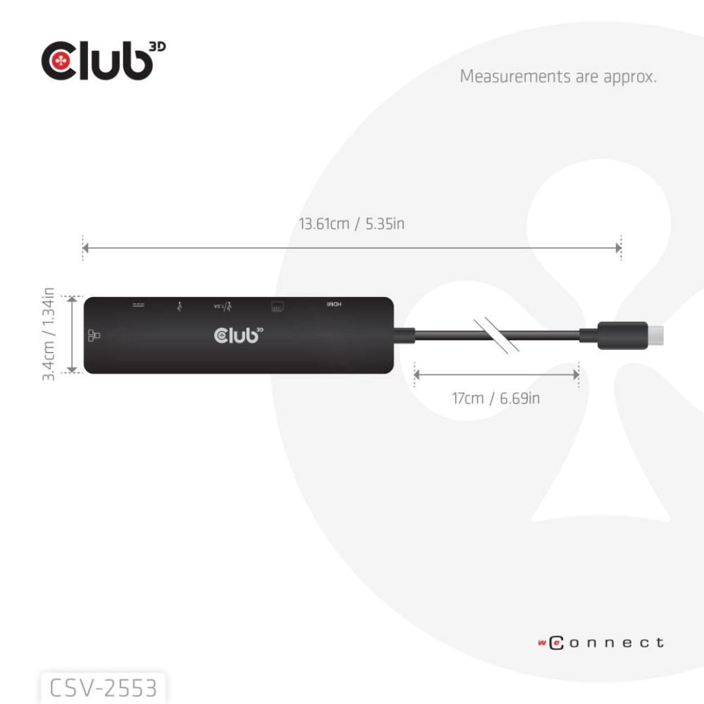 Club 3D CSV-2553 je USB-C, rozbočovač 7 v 1 s HDMI, 2x USB, RJ45, sloty pro karty microSD/SD a portem USB-C samice, který představuje ideální řešení pro rozšíření portu USB-C nebo Thunderbolt 3 (PC/Laptop/tablet/mobilní telefon atd.) speciálně pro hostitele s jediným portem USB-C.