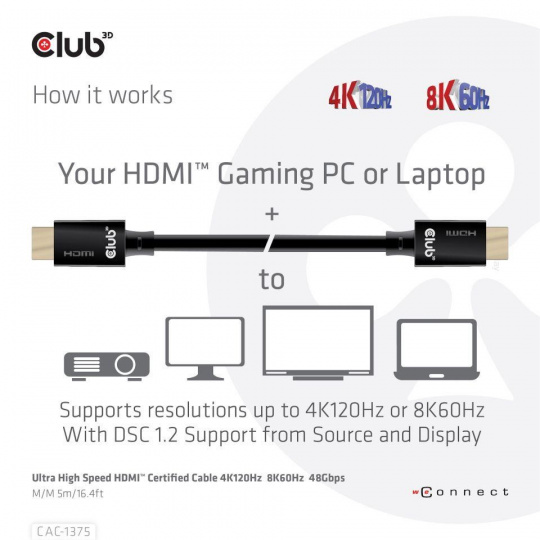 The Club 3D CAC-1375 Ultra High Speed HDMI™2.1 Certified Cable is built to handle the highest quality video- and audio- signals.