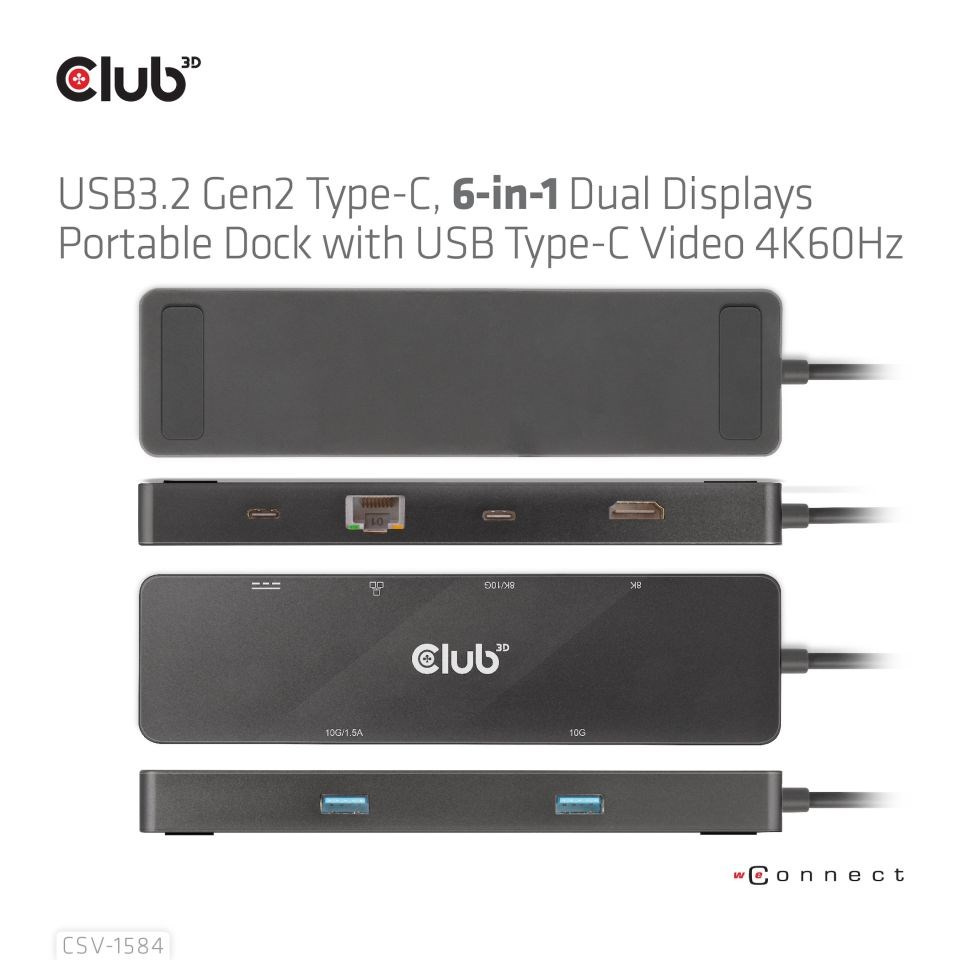 Club 3D CSV-1584 je USB 3.2 Gen2 Type-C, 6-in-1 Hub s HDMI™ 8K30Hz/4K60Hz, 2xUSB Type-A (10G), Ethernet RJ45 (1Gbps) a 2xUSB Type-C, 1x Video 4K60Hz nebo Data (10G) a 1xPD3.0 nabíjení 100 wattů, což poskytuje ideální řešení pro rozšíření portu USB Type-C nebo hostitele Thunderbolt (PC/Laptop/mobilní telefon atd.), zejména pro ty, kteří jsou hostiteli s jedním USB Type-C přístav. Tento rozbočovač využívá integrovaný obvod s podporou režimu DP1.4 Alt, který umožňuje výstup maximálně jednoho 8K30Hz (DSC) nebo dvou různých videí (2krát 4K60Hz) a port USB Type-C Video také podporuje přenos dat USB3.2 Gen2 s maximální rychlostí 10 Gb/s. 2 video porty USB Type-A a USB Type-C umožňují připojit 3 USB zařízení současně. Port Gigabit Ethernet vám umožní surfovat na internetu, port USB Type-C PD Charging podporuje max. 100W PD Charging. Může fungovat na všech hostitelích USB Type-C s podporou režimu DP Alt.