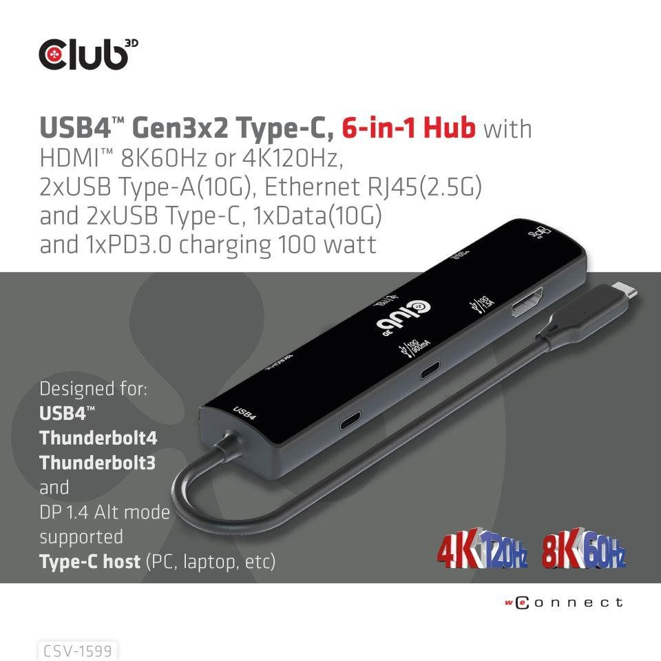 Club3D hub USB Gen3x2 Type-C (USB4), 6-in-1 s HDMI 8K60Hz/4K120Hz, 2xUSB, RJ45 a 2xUSB-C, 1xData, 1xPD - nabíjení 100W