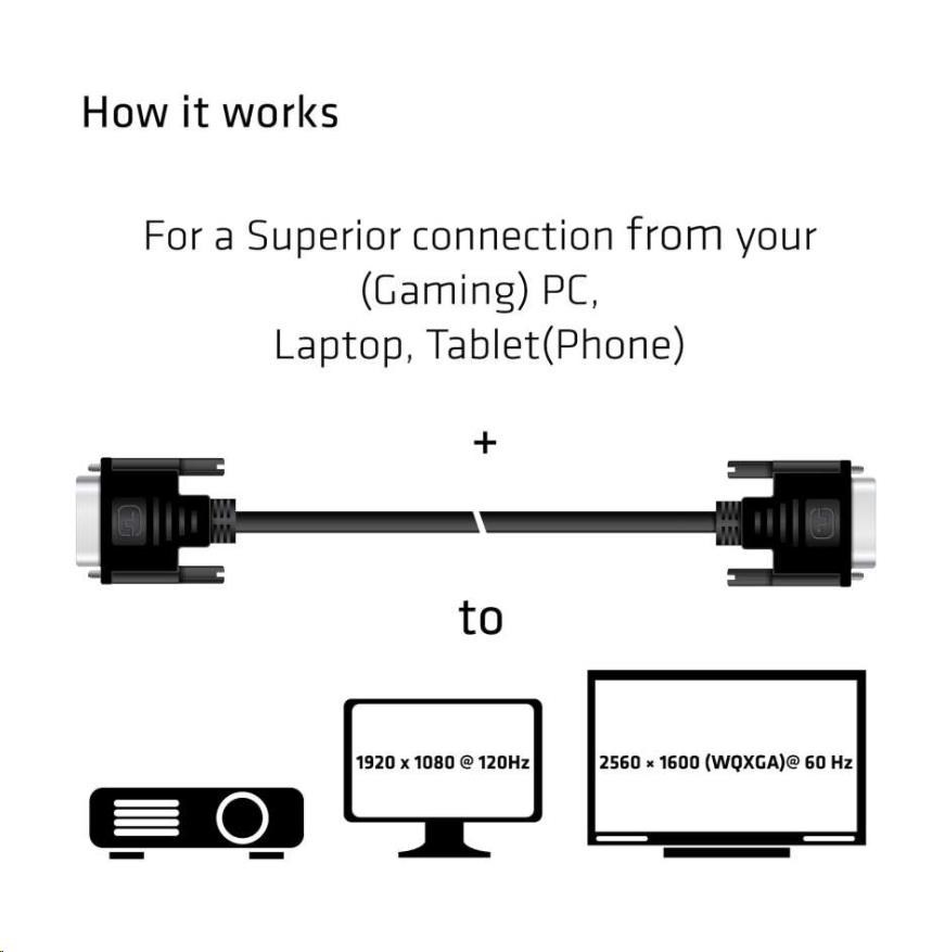 The Club 3D CAC-1223 is a DVI-D(24+1) Male to DVI-D(24+1) Male Cable. This cable is fully Bidirectional. This CAC-1223 Cable is the easiest solution for connecting your DVI-D Monitor, Projector or Television to the DVI-D output of your PC / Notebook / Game Console.