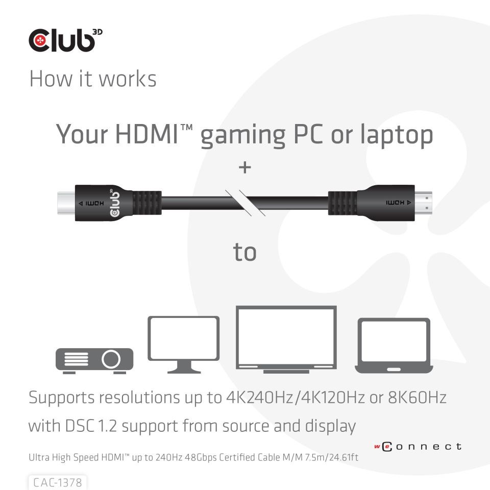 Certifikovaný kabel Club 3D CAC-1378 Ultra High Speed ??HDMI™ je vyroben tak, aby zpracovával video a audio signály nejvyšší kvality. Rozšířená šířka pásma HDMI™ 2.1 na 48 Gb/s. Zvýšení maximální šířky pásma ve srovnání s předchozími verzemi je dosaženo zvýšením bitové rychlosti datových kanálů (z 6 Gb/s na 12 Gb/s) a počtu kanálů (ze 3 na 4). To umožňuje podporu rozlišení až do 4K120Hz nebo 8K60Hz! Nová funkce obsažená v této specifikaci je Display Stream Compression (DSC) 1.2, používá se pro video formáty vyšší než 8K s poměrem stran 4:2:0.