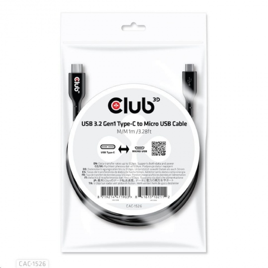 The Club 3D CAC-1526 USB 3.2 Gen1 Type-C to Micro USB Cable enables the connection of your existing USB Type C output connections, Laptops, tablets and Ultrabooks, Power Chargers, etc. to Micro USB inputs, like camera's, Phones and our range of extension cables and adapters.