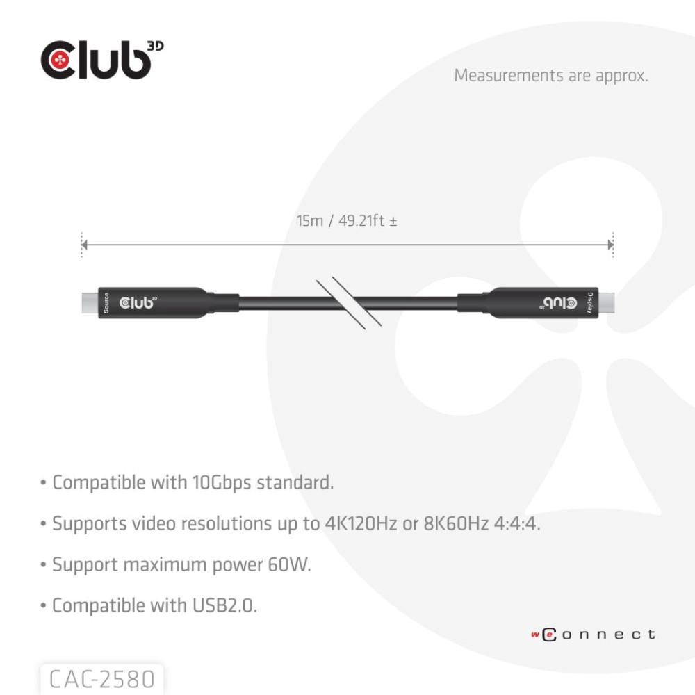 Club 3D CAC-2580 je první plně funkční USB-C® kabel na trhu, který má délku 15 metrů.