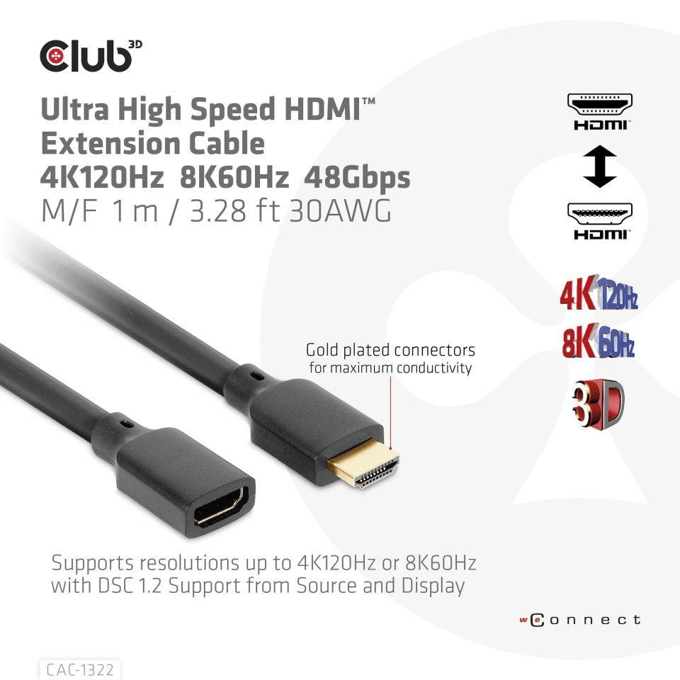 Club3D prodlužovací Ultra rychlý HDMI kabel, 4K120Hz, 8K60Hz, 48Gbps, M/F, 1m, 30 AWG