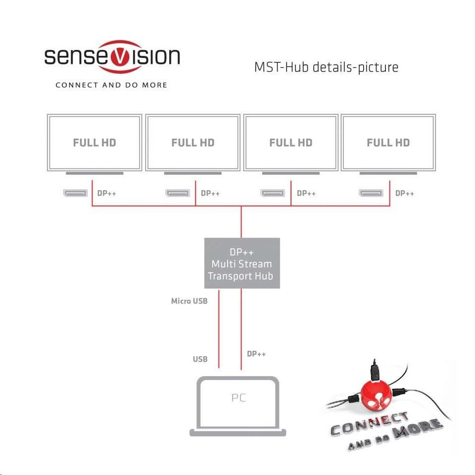 Rozbočovače Club 3D SenseVision MST využívají technologii Multi Stream Transport, jedinečnou funkci DisplayPort ™ 1.2, která umožňuje přenášet více nezávislých nekomprimovaných video (a audio) toků na jediném kabelu. To umožňuje použití více monitorů připojených pomocí rozbočovače MST. Rozbočovače Club3D MST jsou schopny distribuovat tyto video toky na připojené obrazovky.