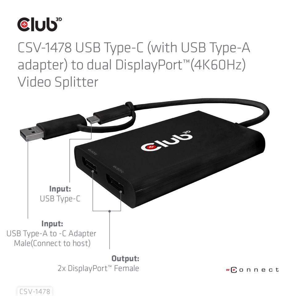 Club3D Video rozbočovač USB-C (USB-A adaptér) na 2xDP 4K60Hz Video splitter