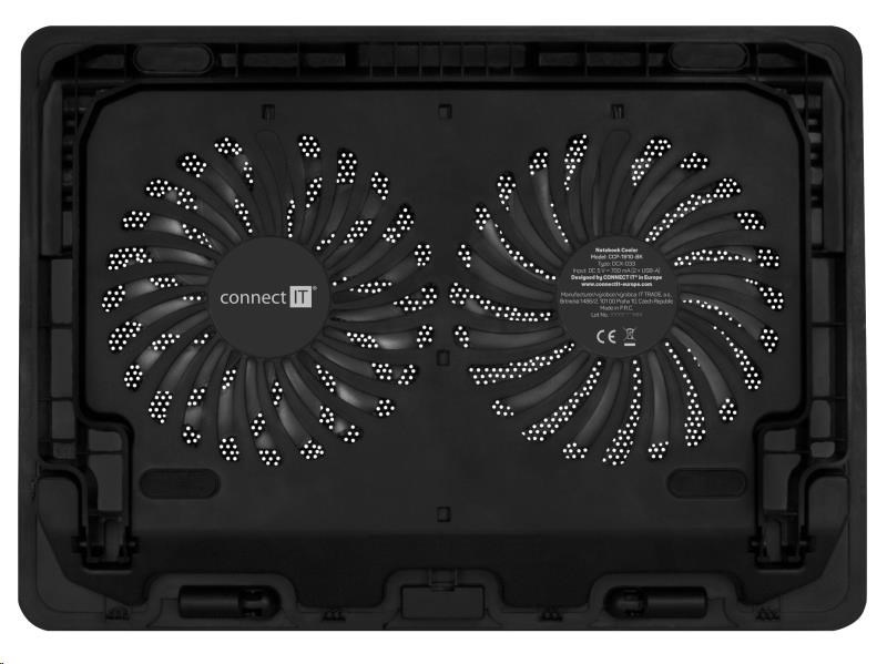 Chladicí podložka pod notebook CONNECT IT "FrostBreeze" CCP-1910-BK, která vybavená dvěma ventilátory s modrým LED podsvícením, celokovovou chladící mřížkou a výškovým čtyřstupňovým polohováním. Kompatibilní s notebooky do 15,6".