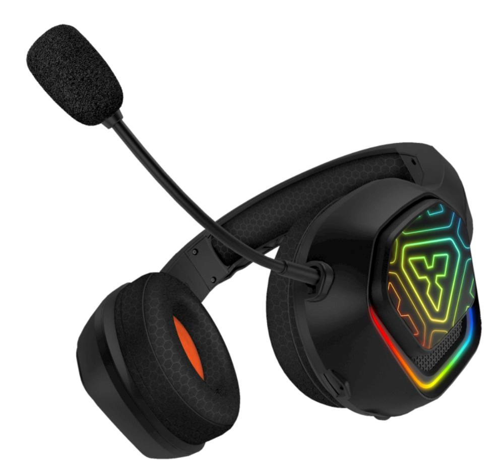 Profesionální herní bezdrátová sluchátka s připojením 2.4GHz a BT "Biohazard Wireless" s odnímatelným mikrofonem a RGB Rainbow podsvícením pro hráče počítačových her.