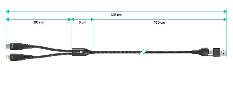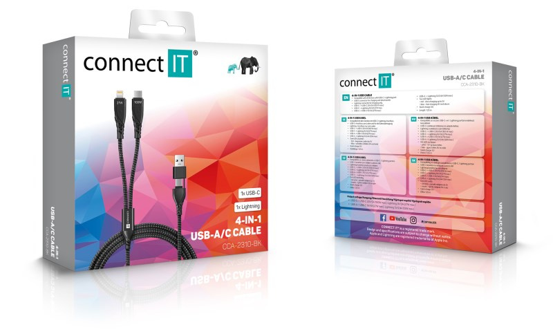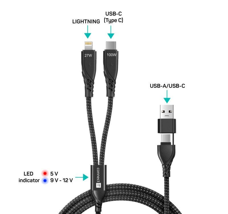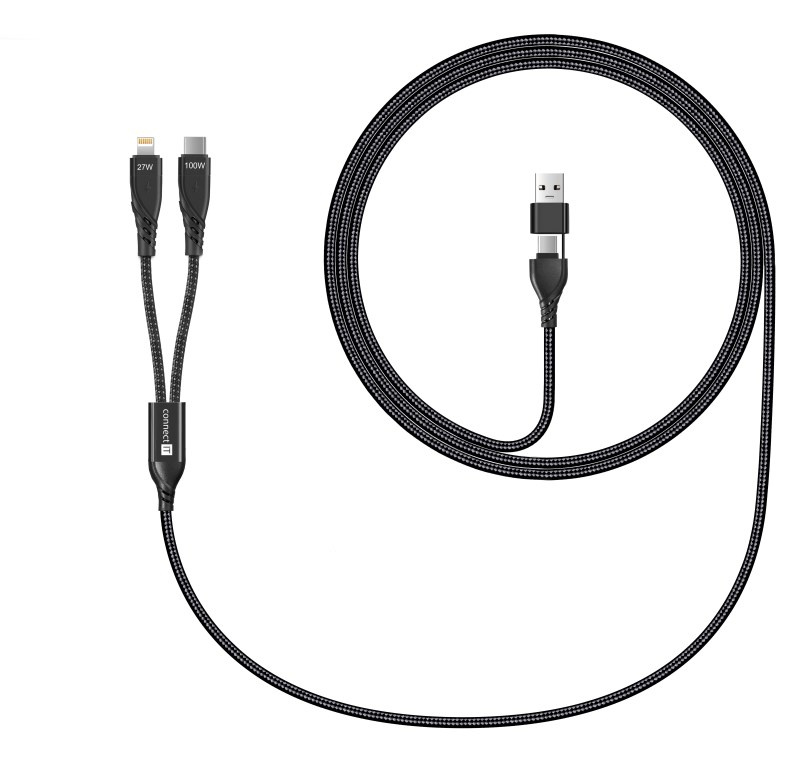 Univerzální nabíjecí kabel 4v1 pro nabíjení zařízení s konektory 1x USB-C a 1x Lightning se vstupním konektrom USB-C a redukcí na USB-A. Umožňuje nabíjení až dvou zařízení současně s podporou rychlého nabíjení pomocí max. proudového toku 5 A. Speciální manžetová nadstavba konektorů zaručuje lepší přístupnost k nabíjecím zdířkám mobilních telefonů v pouzdrech.