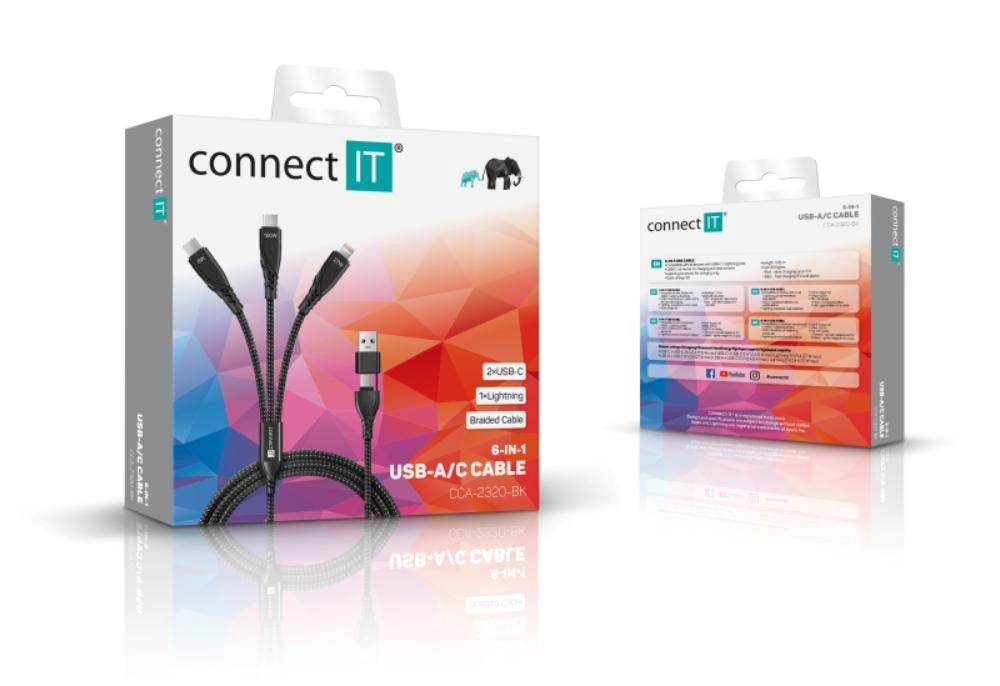 CONNECT IT Nabíjecí kabel Wirez 6v1, USB-C/USB, Lightning + 2x USB-C, 1.25m, černá