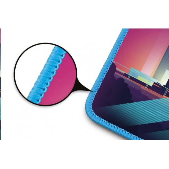 Podložka má měkký, příjemný povrch s nadčasovým cyber potiskem. Při velikosti herní plochy 320 × 245 mm vám nikdy nedojde prostor k pohybu. Velkou výhodou je pogumovaná protiskluzová spodní strana a antistatický povrch, po kterém bez problému bude jezdit každá myš. Materiál byl navržen tak, aby odpuzoval vodu a nečistoty. Podložka má obšité okraje speciální kvalitní svítící nití, která ve tmě jemně svítí.