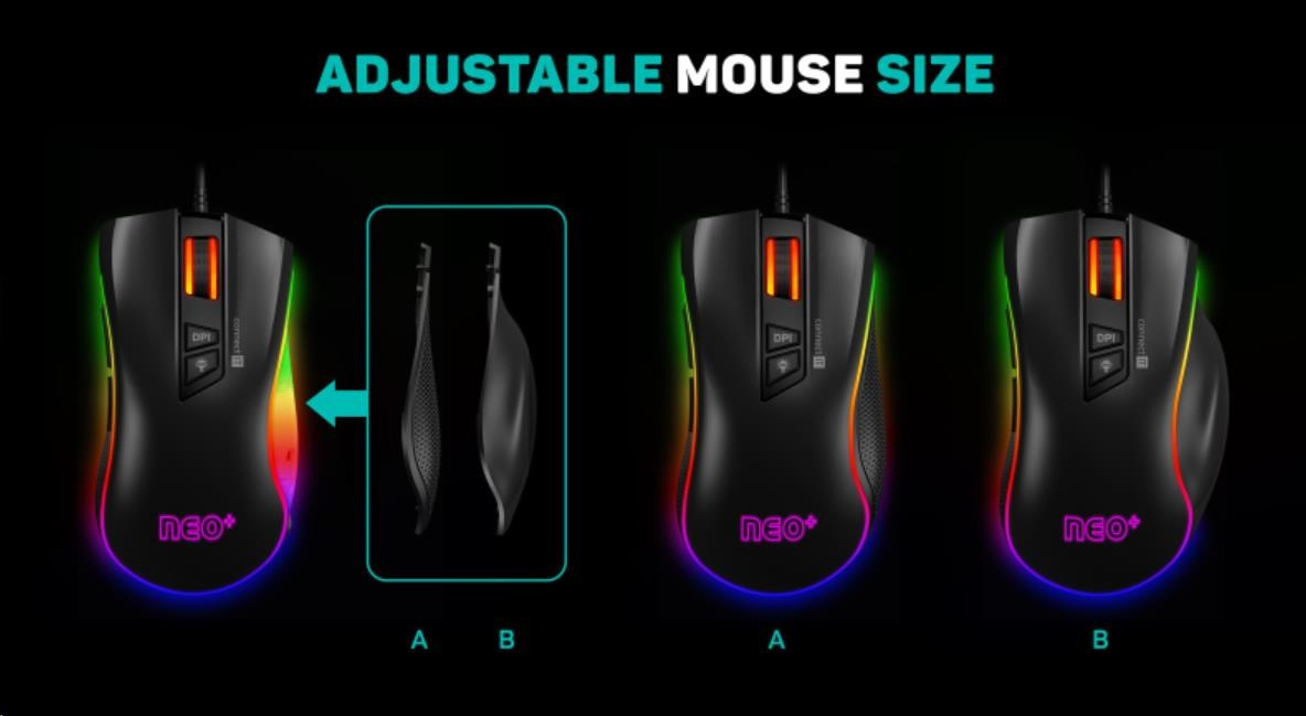 Kromě běžných funkcí je tato myš unikátní nastavitelnou velikostí a to pomocí odnímatelné pravé bočnice. Takto si myš přizpůsobíte svým potřebám. Část myši je pokryta povrchem "honeycomb grip" pro stabilnější a pevnější úchop i při dlouhodobém hraní. K této myši je dodáván arch promo samolepek "CONNECT IT NEO" a software ke stažení zcela zdarma na stránkách www.connectit-europe.com. Samozřejmostí je u této série prémiový oplet přívodního kabelu a pozlacený USB konektor.