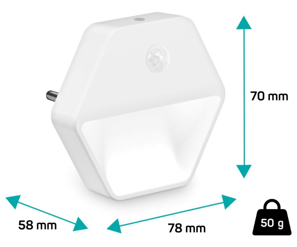 Světlo disponuje posuvníkem, který umožňuje zapnout/vypnout světlo a nastavit režim automatického zapnutí při zaznamenání pohybu v šeru. Světlo stačí jednoduše zapojit do libovolné zásuvky a při příkonu 0,60 W se nemusíte bát spotřeby elektrické energie. LED zdroj světla disponuje světelným tokem 30 lumenů.