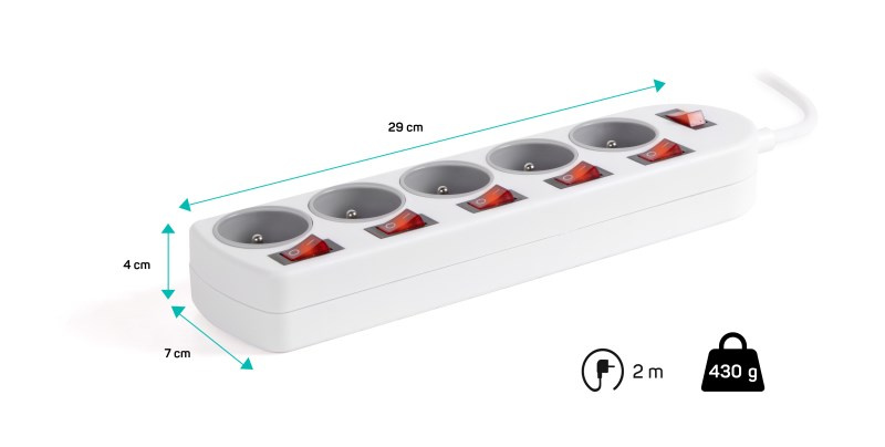 Prodlužovací kabelový přívod na 230 V je vybaven hlavním síťovým vypínačem, který při vypnutí zcela odpojí od přívodu elektrické energie všechny zapojené spotřebiče najednou. Prodlužovací kabel také disponuje s vypínači pro každou zásuvku zvlášť, sami si zvolíte, které zásuvky budou kdy zapnuty nebo vypnuty bez potřeby odpojování připojovacího kabelu od elektrospotřebiče. Extra výbavou je dětská ochrana všech zásuvek – zásuvky jsou přístupné pouze v případě zasunutí obou vidlic najednou, nelze tedy zasunout jednotlivě např. pouze šroubovák nebo pletací jehlici. Díky pootočení zásuvek o 45° je možné používat i objemnější napájecí adaptéry nebo úhlové koncovky.