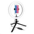 Kruhové selfie LED světlo "Selfie10Ring" s flexibilním držákem na mobilní telefon a stativem s kulovou hlavou pro domácí i profesionální použití umožňuje nastavit barevnou teplotu světla na 3 různé úrovně (3000/4500/6500 K). Součástí výbavy je dálkový ovladač na kabelu.