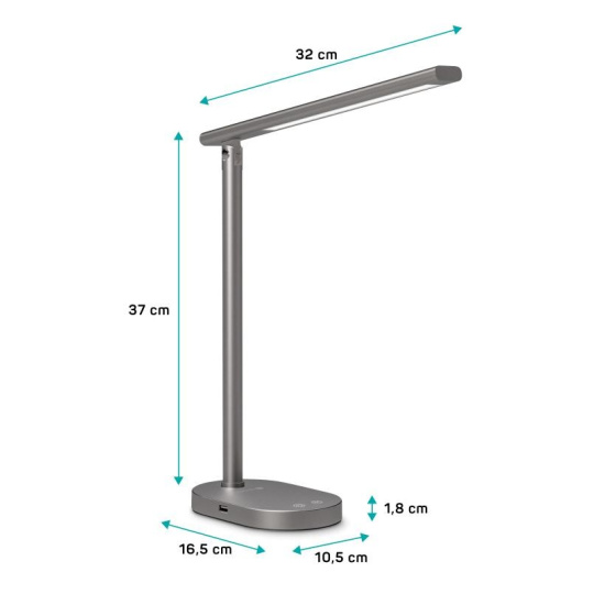 Díky sklopnému rameni nastavíte dokonalý úhel pro jakoukoliv práci. Lampička disponuje USB-A výstupem s výkonem 5 W a dvěma praktickými dotykovými spínači, které umožňují zapnout/vypnout lampu, nastavit 3 úrovně jasu světla nebo nastavit barevnou teplotu světla ve 3 různých úrovních (3000/4000/6500 K).