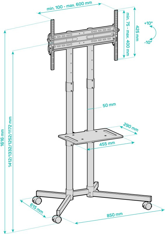 Velmi praktický pojízdný stojan je určen pro variabilní umístění TV kdekoliv v interiéru. Díky stojanu můžete přesouvat TV rychle a pohodlně kamkoliv podle potřeby. Navíc je vybaven praktickou poličkou na DVD, Set-top box atp. Robustní konstrukce z oceli unese spolehlivě až 40 kg obrazovku. Police má nosnost 10 kg. Stojan je kompatibilní s obrazovkami do úhlopříčky do 70" a pro nejvyšší možnou stabilitu je vybaven kolečky s brzdovou mechanikou proti nechtěnému pojezdu.