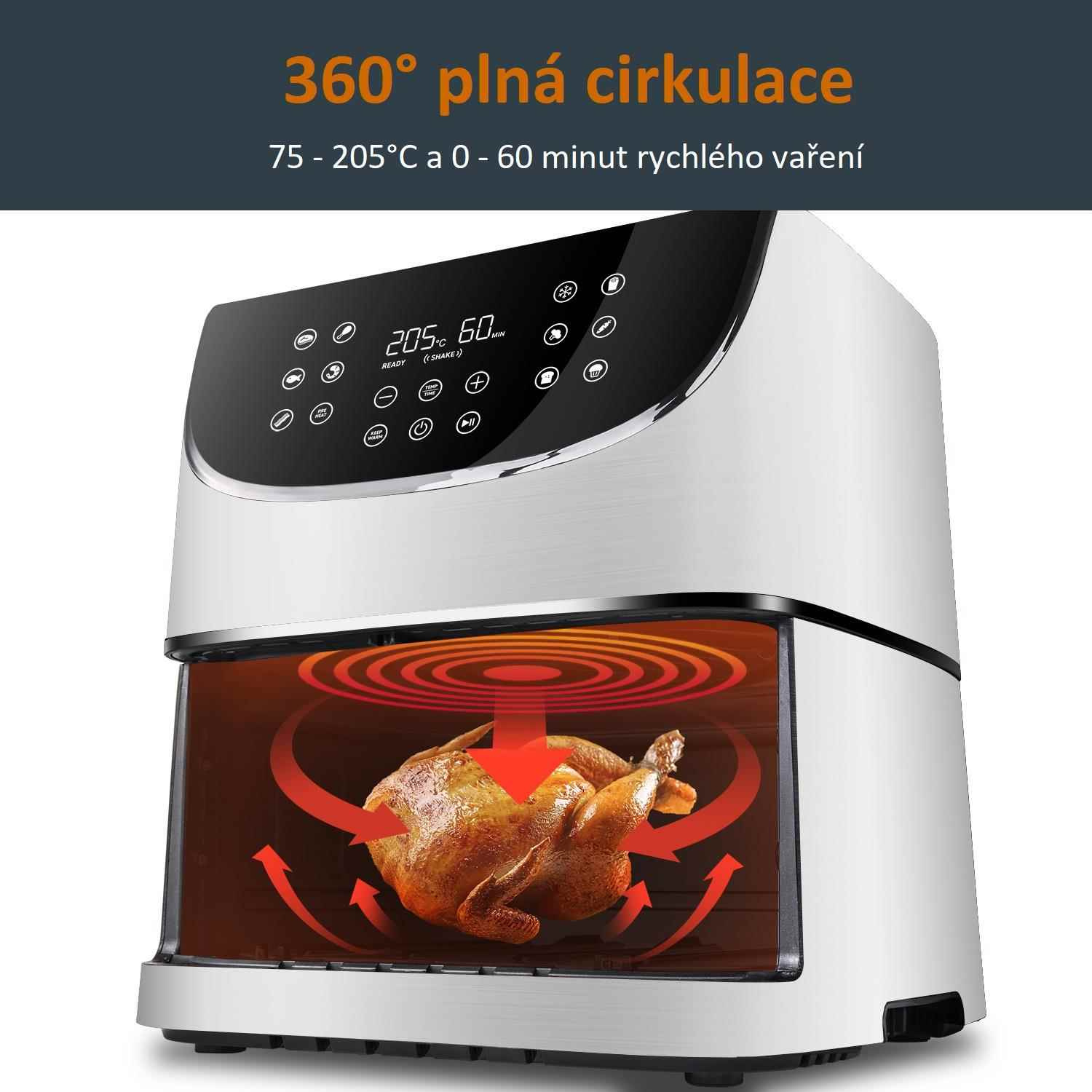 Horký vzduch rotuje kolem jídla ze všech stran a tím dosahuje kvalitního a rovnoměrného propečení a uvaření pokrmů. Díky této technologii se fritéza předehřeje během pouhých 5 minut.