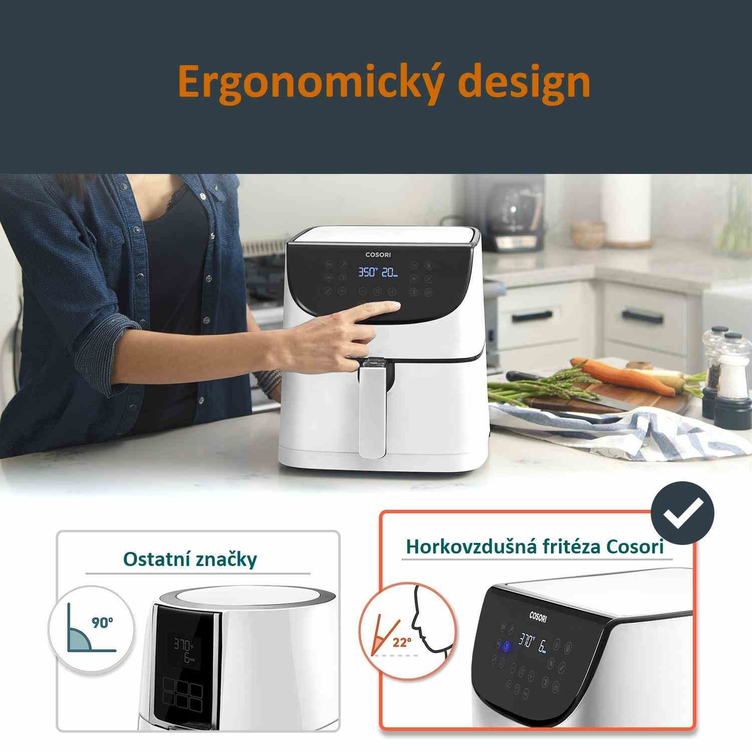 Design horkovzdušné fritézy COSORI CP158-AF byl navržen v Kalifornii. Díky své praktičnosti, funkcím, ovládání i přehlednému dotykovému nakloněnému LED displeji se snadno přístupnými tlačítky získal také prestižní ocenění Red Dot Award a Design Award za nejlepší design. Povrchová úprava je navíc odolná vůči otiskům prstů, takže fritéza bude ve vaší kuchyni vypadat pořád skvěle. Podle prodejních statistik je značka COSORI také nejprodávanější značkou horkovzdušných fritéz v USA.