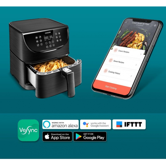 Modernized Cooking: Winner of the 2019 Red Dot Award and proudly designed in California, the Cosori VeSync Pro Smart 5.8-Quart Air Fryer has built-in smart capabilities that allow you to remotely adjust settings and monitor meals from your smartphone3 Ways to Control: Whether you’re controlling your air fryer directly from the display, remotely through the VeSync app, or just with the sound of your voice using Alexa or Google Assistant, cooking is always a breezeOver 100 Recipes: No matter what your skill level is in the kitchen, 100 detailed step-by-step recipes with supplemental videos in the VeSync app make cooking simpleManage Recipes: With VeSync, you can mark your favorite recipes, view your recipe history, and create and save your own custom recipes to spend less time searching and more time cookingMonitor From Anywhere: Keep track of your meal progress while you relax on the couch or multitask around the house with VeSync notificationsSuitable for Anyone: No matter what your skill level is in the kitchen or how busy your schedule gets, everyone can enjoy crispy, perfectly cooked meals in just minutes with the Cosori VeSync ProLess Oil: Enjoy the same crispy textures you love with up to 85% less fat than traditionally fried foods and no deep-fried cooking fumes lingering in the kitchen afterwardLarge Capacity: Cook enough food for up to 4 people or an entire 5-pound rotisserie chicken in the roomy 5.8 qt/5.5L square basket. Easy Cleanup: Enjoy quick cleanup with removable, nonstick, and dishwasher-safe baskets that are free from PFOAs and BPA.... více