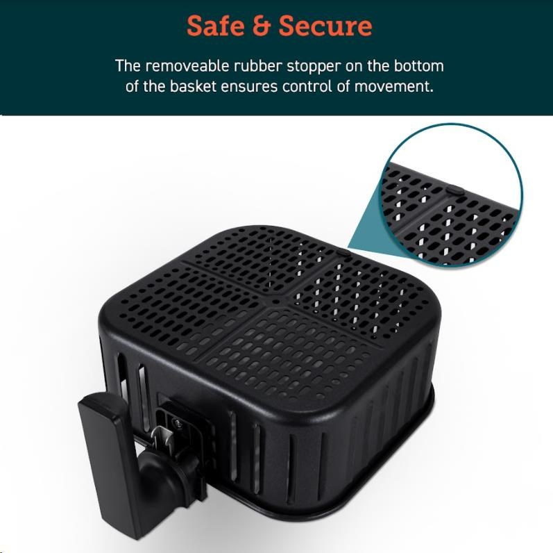 Nepřilnavý koš: Jídlo lze vyjmout stejně snadno jako při vložení. Nepřilnavý povrch koše znamená, že po něm zůstane méně zbytků. Čištění nebude tak drsné. Nikdy nečistěte koš, pokud je příliš horký.