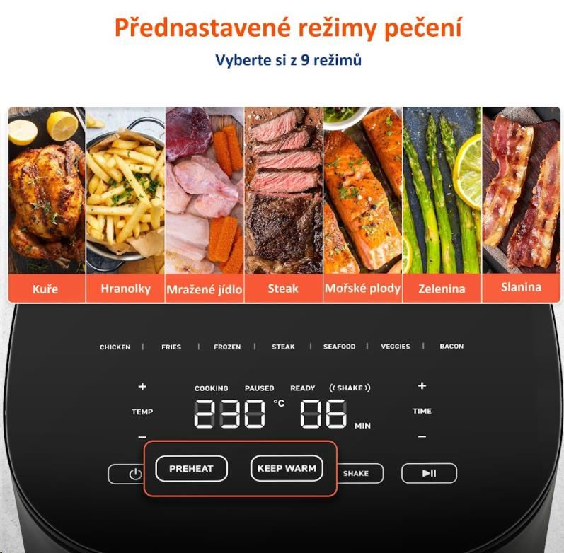 Samozřejmostí je také možnost manuálního nastavení teploty v rozmezí 75-230°C a doby přípravy jídla (až 60 minut).