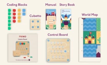 Každá z těchto sad obsahuje hrací mapu z polyesteru o velikosti 1 x 1 metr, která je rozdělena na 36 polí o rozměrech 15 x 15 cm, a knihu s příběhy, ve kterých Cubetto prožívá svá dobrodružství.