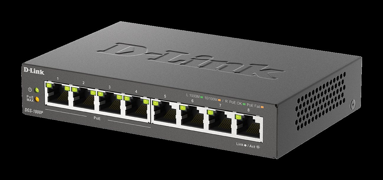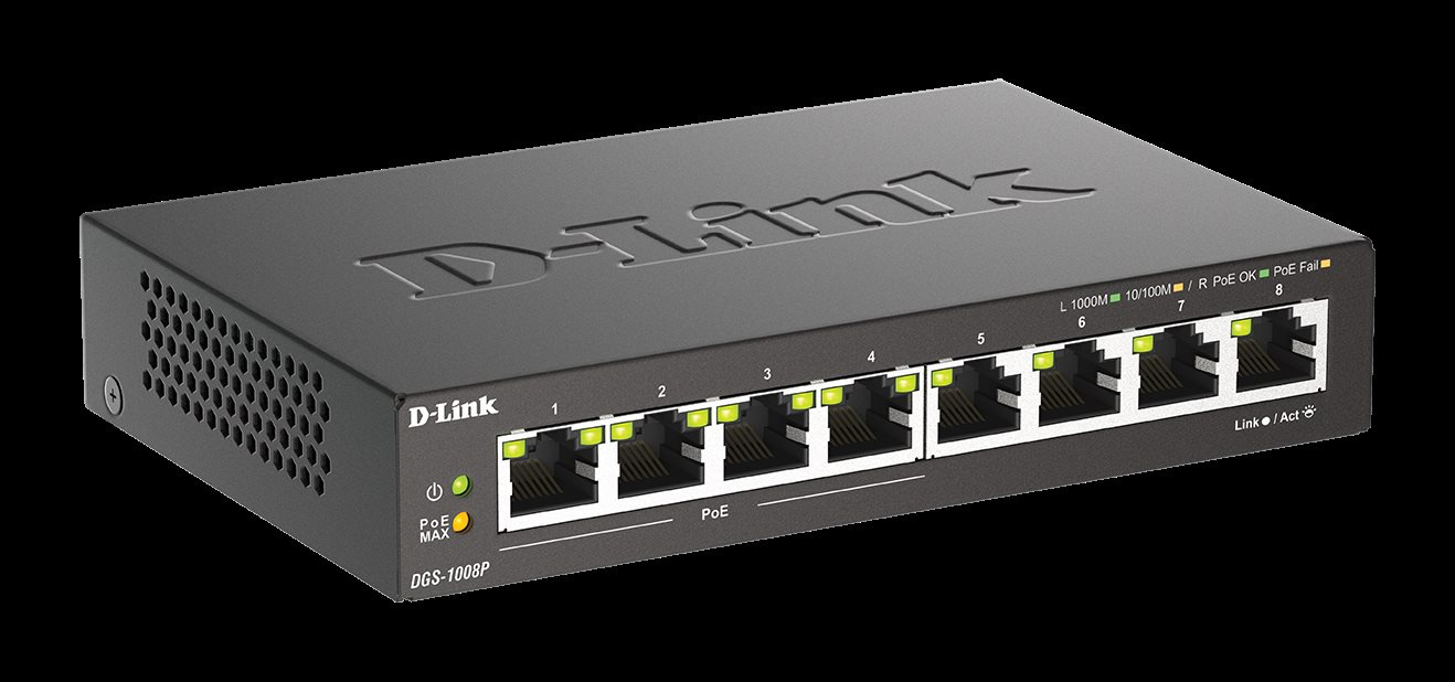 D-Link DGS-1008P 8-port Gigabit Desktop Switch, 4 porty jsou PoE+, PoE budget 68W