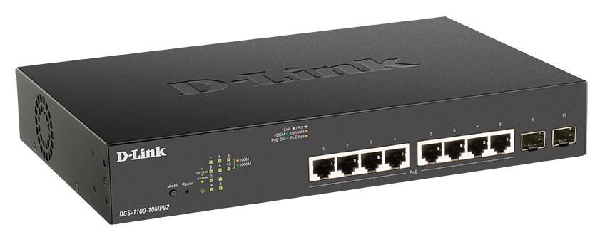 D-Link DGS-1100-10MPV2 10-Port PoE+ Gigabit Smart Managed Switch, 8x PoE gigabit, 2x SFP, PoE budget 130W