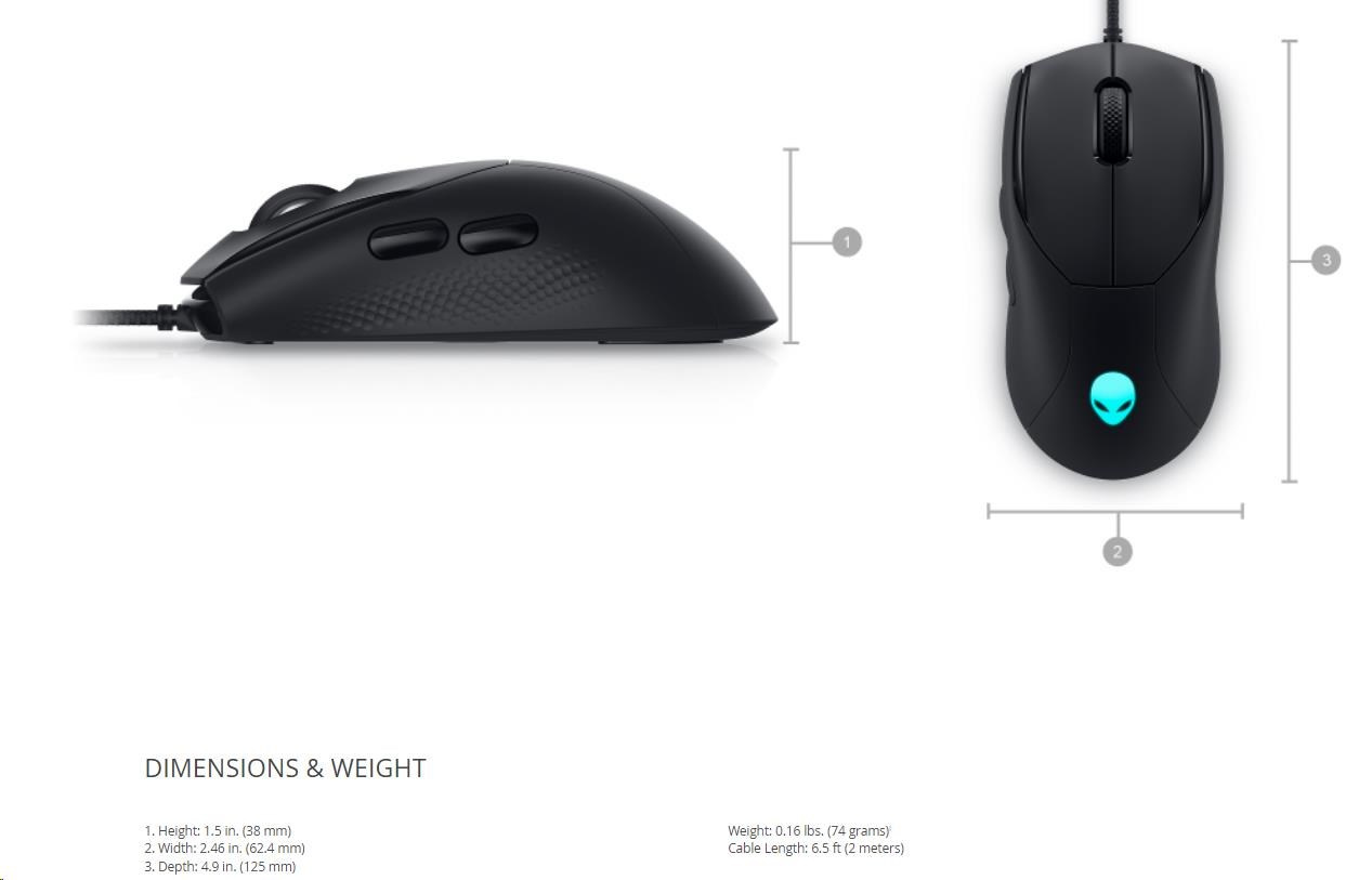 Features Auto-calibration, 6 programmable buttons, 5 on-the-fly DPI settings, 16.8 million AlienFX lighting, 60 million clicks