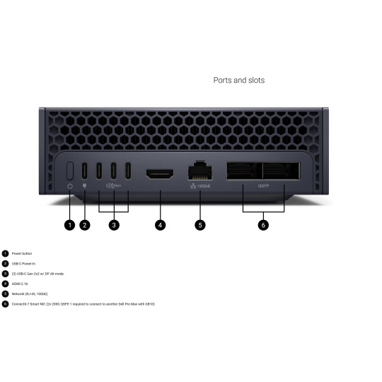 | LAN/NIC | Network (RJ-45, 10GbE), ConnectX-7 Smart NIC (2x 200G QSFP, 1 required to connect to another Dell Pro Max with GB10) |