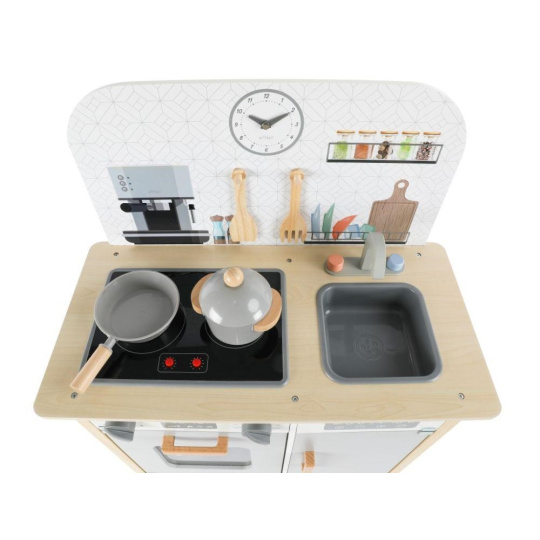 Menší dětská kuchyňka v neutrálních barvách, doplněná o bohaté příslušenství a textilní kuchařský set ZDARMA, promění holčičky i chlapce v opravdové kuchaře. Kuchyňka ve skandinávskému stylu, se spotřebiči a parádními doplňky, je vhodná do každé místnosti. Menší dřevěná kuchyňka je edukativní hračkou, která umožní dětem vyzkoušet si vaření, pečení a další činnosti bezpečným dětským způsobem. Při hře v kuchyňce děti zdokonalí své dovednosti a ještě si užijí spoustu zábavy..