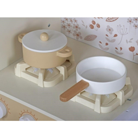Dětská kuchyňka ve světlých barevných tónech, zdobená květy, je stylovou edukativní hračkou pro děti od 3 let věku. V dřevěné kuchyňce s moderními spotřebiči a tekoucí vodou popustí děti uzdu své fantazii, mohou vařit, péct a ohřívat pokrmy, uvařit kávu a klidně vyprat špinavé prádlo. Jednoduše si vyzkouší dospělácké činnosti bezpečným dětským způsobem. Reálný nádech celé hře dodají zvukové efekty, které vydává sporák nebo vodovodní baterie..