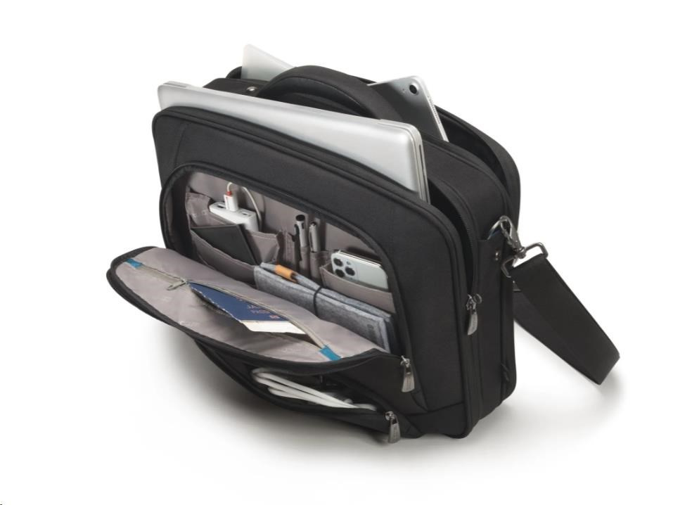 Hrajte bezpečně s Eco Multi PRO! Brašna ve tvaru škeble vás spolehlivě doprovodí všude a splňuje nejvyšší standardy kvality, funkčnosti a ochrany. Systém Fitall s integrovaným popruhem pro uchopení a polstrovanými oddělovači upevní váš 11-14,1" notebook a bezpečně jej dopraví na místo určení. Uzavíratelná kapsa na notebook, polstrování z pěny s vysokou hustotou (HDF) a rám vyztužený kovem zajišťují všestrannou ochranu. Polstrovaná přihrádka pro tablet do velikosti 12,9" chrání před nárazy a je uvnitř vybavena extra měkkým Nylexem. Velkorysý úložný prostor pro vaše dokumenty a mobilní příslušenství. Dvě další přihrádky na dokumenty v zadní části. Přední kapsa s klíčenkou a vkládacími kapsami umožňuje uspořádat osobní vybavení. Dlouhodobé pohodlí při nošení díky pohodlným a nýtovaným rukojetím, nastavitelnému polstrovanému ramennímu popruhu a praktickému popruhu pro upevnění na vozík. Kufr Eco Multi PRO je tedy ideální pro vás, pokud jste stále na cestách a chcete podpořit recyklaci PET lahví ekologickým kufrem.
