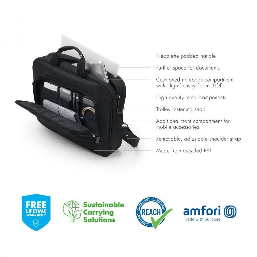 The compact Eco Traveller BASE case offers ideal protection for laptops between 15 and 15.6" thanks to its high-density foam (HDF) padding. The case guarantees extra stability and protection with its metal frame, as well as flexible mobility thanks to its lightweight design. There is an extra compartment in which you can easily store documents. Your smartphone or other smaller items like cables, pens or chargers can be stored in the convenient front pocket, so they are always to hand. The case is comfortable to carry thanks to its Neoprene padded carrying handle and it can be attached to a suitcase in seconds with its built-in strap. You can also carry the case using its adjustable shoulder strap. The Eco Traveller BASE is therefore perfect for you if you are always on the go and want to support the recycling of PET bottles with an eco-friendly case.