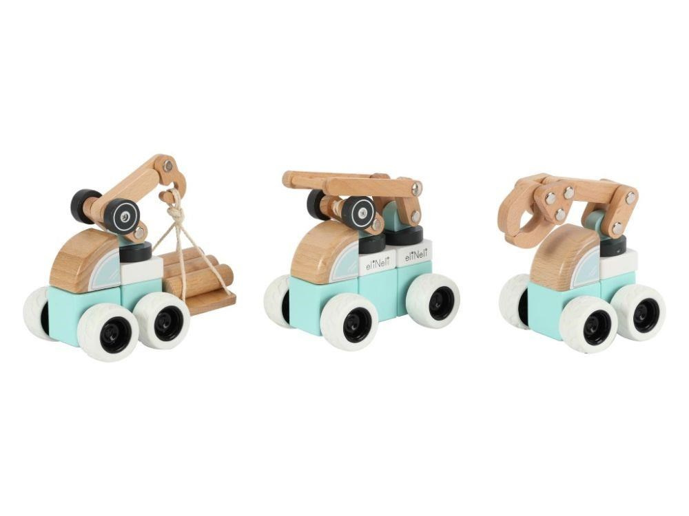 Sada dřevěných aut (strojů) nabízí spoustu možností ke hře. Každé auto je sestavené z kostek v barvě bílé, mátové nebo barvě přírodního dřeva a každé z aut obsahuje pohyblivou část (pohyblivé rameno nebo žebřík) pro ještě více zábavy. Auta jsou vyrobená tak, aby dobře padla do dětské ruky, pohodlně se držela a snadno se s nimi manipulovalo. Gumová kola tlumí hluk a šetří podlahu..