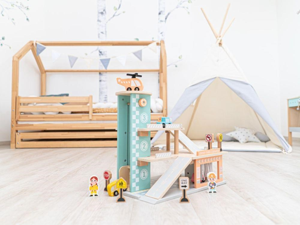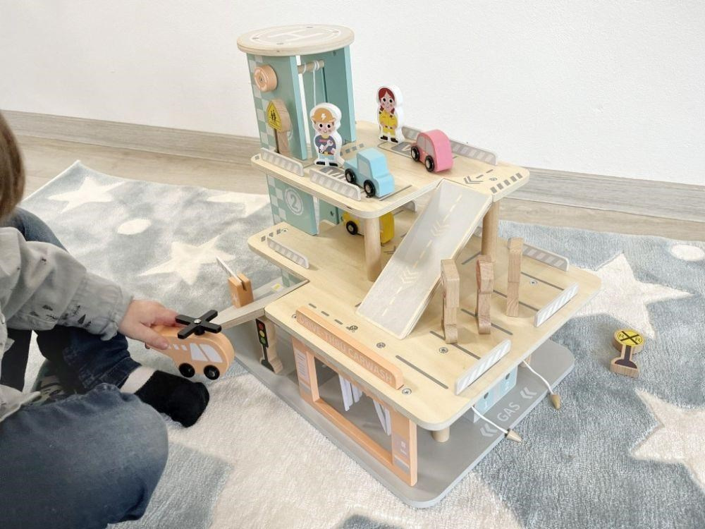 Garáž na autíčka s myčkou, v krásných jemných barvách, přinese dětem spoustu zábavy. Součástí 3 patrové dřevěné garáže je parádní myčka aut, tankovací stojan, výtah, heliport i spousta parkovacích míst pro autíčka. Bohaté příslušenství v podobě helikoptéry, autíček, dopravních značek a obsluhy garáže umožní, aby si s garáží pro autíčka vyhrálo vaše dítko samo nebo se svými kamarády..