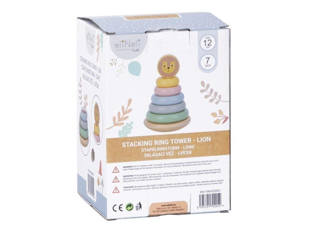 Skládací věž (pyramida) je oblíbenou dřevěnou hračkou, která nesmí chybět v žádném dětském království. Skládací věž s kroužky v jemných pastelových barvách a lvíčkem zdokonaluje jemnou motoriku, koordinaci očí a rukou, logické myšlení, učí děti poznat rozdíl mezi větší a menší, soustředit se a trpělivosti..