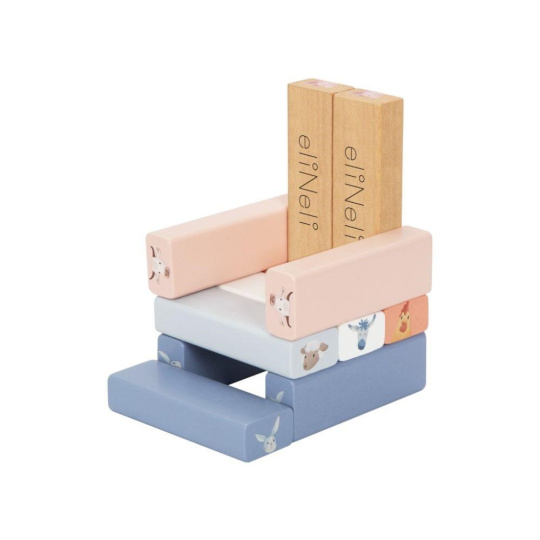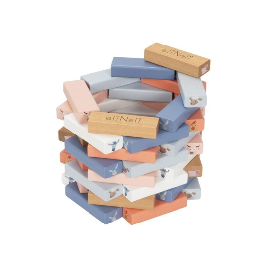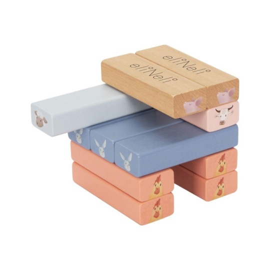 Dřevná skládací věž Jenga v příjemných pastelových barvách, s motivem zvířátek z farmy, s bohatým příslušenstvím, je zábavnou hrou pro děti i celou rodinu. Skládací věž nabízí spoustu možností ke hře s různou mírou obtížnosti. Ty nejmenší děti si pohrají s dřevěnými kostkami, větší děti postaví věž a pokusí se vytahovat kostky s motivem zvířátka, které padlo na kostce nebo si vylosovaly z kartiček a ti největší šikulové mohou kostky z věže vytloukat kladívkem..