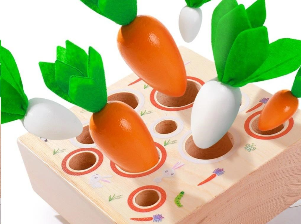 Originální dětská vkládačka s různě velkými otvory a s různě velkými mrkvičkami zdokonalí motorické dovednosti, koordinaci očí a rukou a potrápí i dětskou mysl. Při vkládání je potřeba vybrat mrkvičku nebo petržel ve správné velikosti. Pro velké šikulky je vkládací hra ztížena barevnými kroužky okolo otvorů, aby děti musely vybrat nejen správnou velikosti, ale i barvu zeleniny. Při hře děti přirozeným způsobem zdokonalují své dovednosti, učí se poznávat barvičky, rozdíl mezi větší menší, zdokonalují logické myšlení, učí se trpělivosti a soustředit se a zcela jistě si užijí i spoustu zábavy.