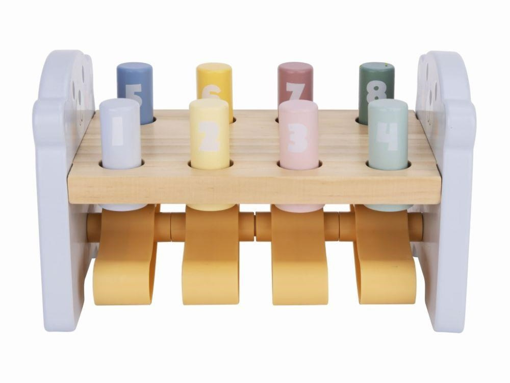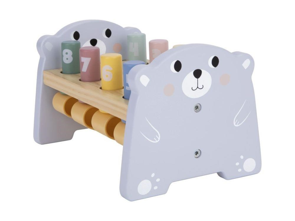 Zatloukačka pro děti je klasickou dřevěnou hračkou, která potěší každé dítko. Dřevěná zatloukačka v krásných barvách, s roztomilým medvídkem, s očíslovanými válečky a malou vychytávkou rozvíjí dětské dovednosti, naučí děti poznávat barvičky i číslice..