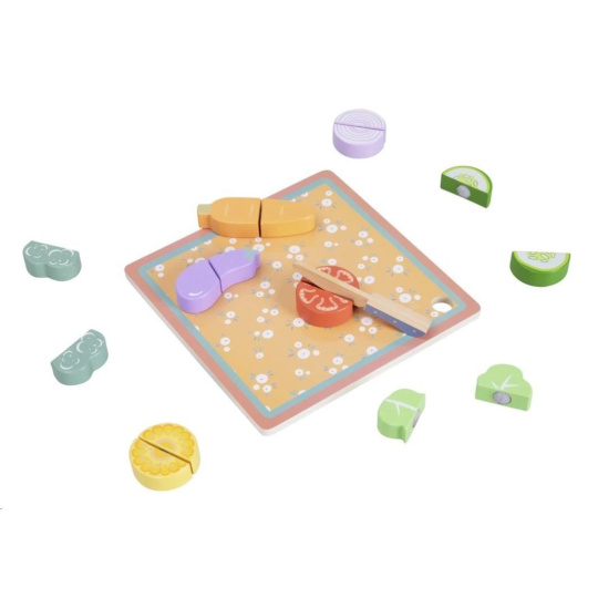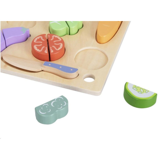 Dřevěná zelenina ke krájení je hračkou, která by neměla chybět v žádné dětské kuchyňce ani dětském obchůdku. 9 druhů zeleniny je rozděleno na poloviny spojené suchým zipem, díky kterému děti zeleninu dřevěným nožem jednoduše rozkrojí. Toto krájení zdokonalí motorické dovednosti a manuální zručnosti, děti si vyzkouší krájení bezpečným dětským způsobem. Balení obsahuje dřevěnou zeleninu, dřevěné prkénko i dřevěný nůž.
