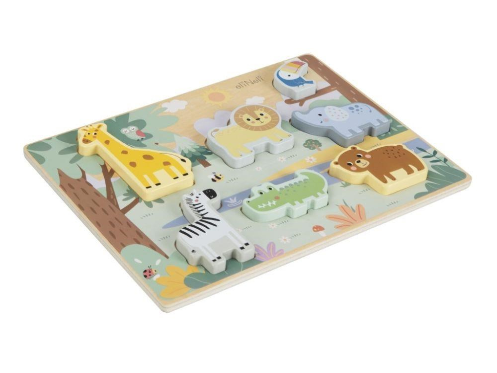 Vkládací puzzle pro děti s oblíbenými zvířátky - žirafou, zebrou, lvem, krokodýlem, medvědem, slonem a tukanem, zavede děti do ZOO. S dřevěnou hrací deskou a dřevěnými puzzle dílky v podobě zvířátek děti potrénují motorické dovednosti, koordinaci očí, logické myšlení, naučí se trpělivosti a soustředit se..