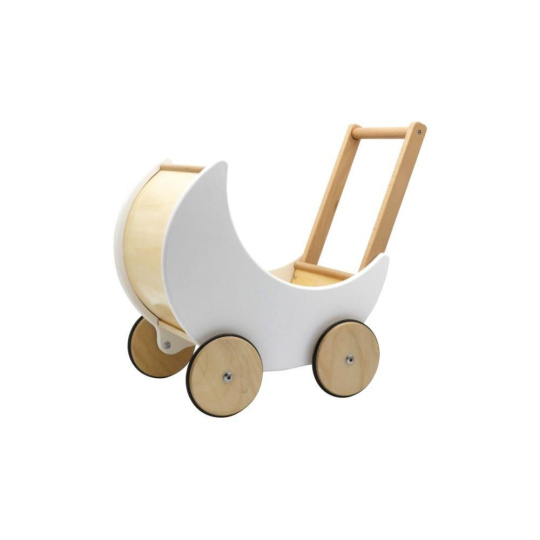 Designový kočárek ve tvaru měsíčku, vyrobený z přírodního dřeva, je jako stvořený pro krátké i dlouhé procházky, uspávání oblíbených panenek nebo plyšáků. Dřevěný kočárek dobře padne do dětské ručky, snadno se řídí a ovládá. Kočárek pro panenky zaparkovaný v dětském království vaší princezny je současně i krásnou dekorací..