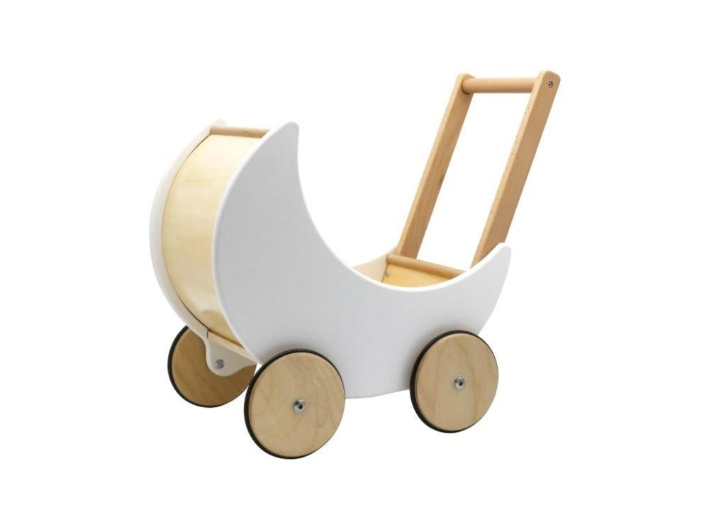 Designový kočárek ve tvaru měsíčku, vyrobený z přírodního dřeva, je jako stvořený pro krátké i dlouhé procházky, uspávání oblíbených panenek nebo plyšáků. Dřevěný kočárek dobře padne do dětské ručky, snadno se řídí a ovládá. Kočárek pro panenky zaparkovaný v dětském království vaší princezny je současně i krásnou dekorací..